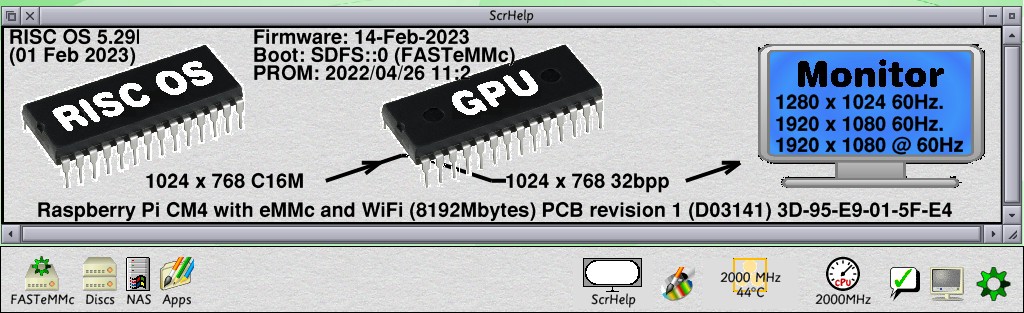 This screen & platform information utility for RISC OS is principally designed for the Raspberry Pi but runs on any RISC OS machine.