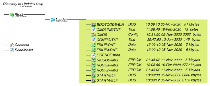 Update 14: November 2020 firmware plus RISC OS 5.28 (5-Oct-2020) and RISC OS 5.29 (13-Nov-2020) for the Pi400 includes only the 'Loader' part of the !Boot directory from the standard HardDisc4 image.