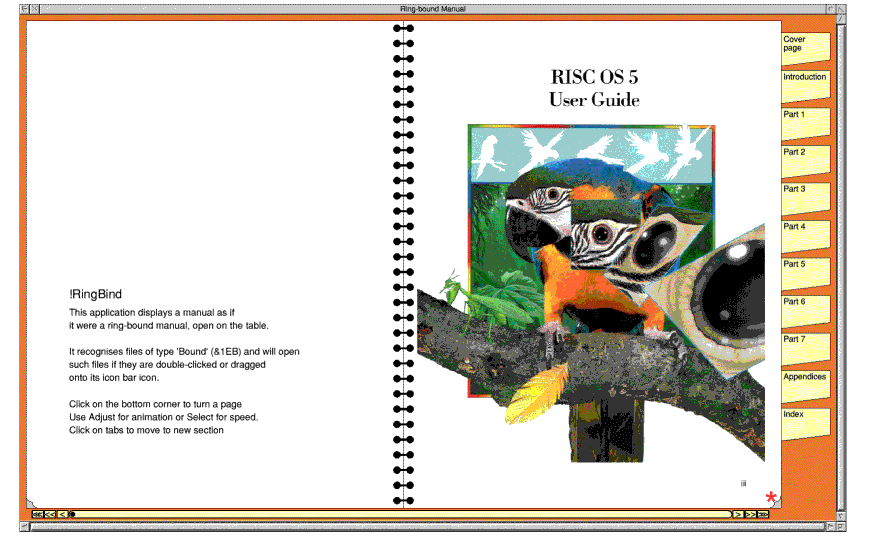 Now for a bit of a gimmick - also on show is some software, RingBind, which will display a manual on the desktop as if open on the table. As each page is turned, an animated view of it turning is provided. One example provided is the current RISC OS User Manual, now released under the Apache licence. Full instructions for converting your own manuals are provided.