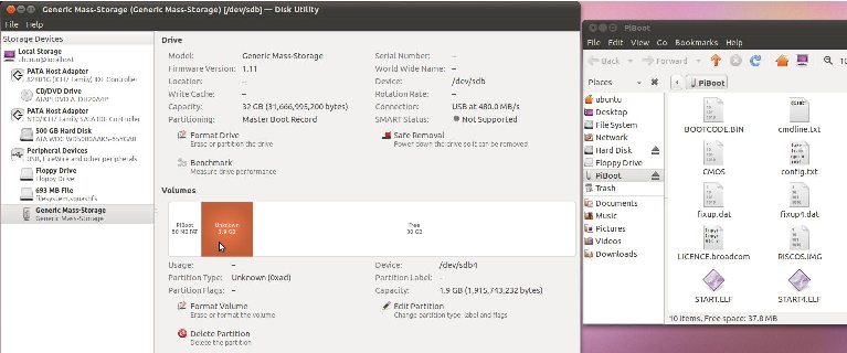 Let us look at the Raspian distribution (see illustration on next page) - this is also a two-partition SD card image which includes a 256MB fat partition and a 3384MB Linux partition which is seen (by Linux) as /dev/sdb2. Note that the contents of both partitions are displayed.