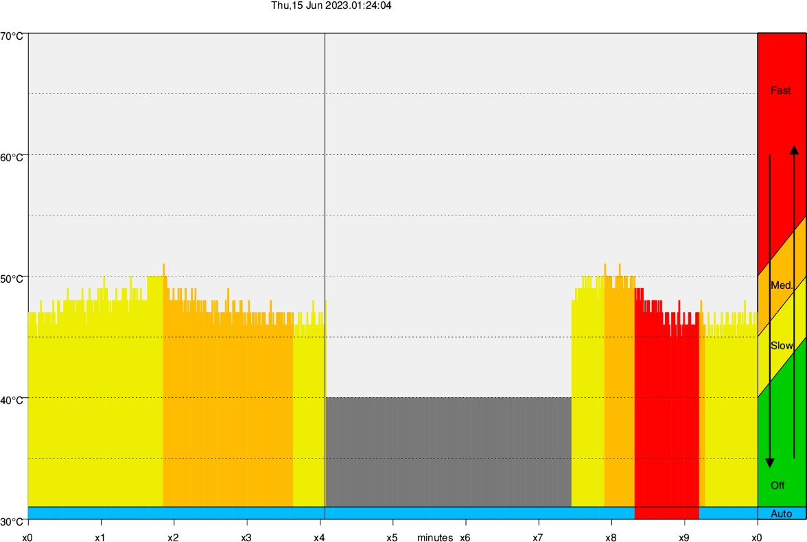 The utility FanCon generates a temperature graph. The unit is steady at 49°C (01:17:30) on auto control and fan speed increases as it touchs 50°C to medium (orange). It is switched manually to full speed (Red) at 01:18:20 and then put back on auto at 01:19:20. As workload eases, the temperature drops again.