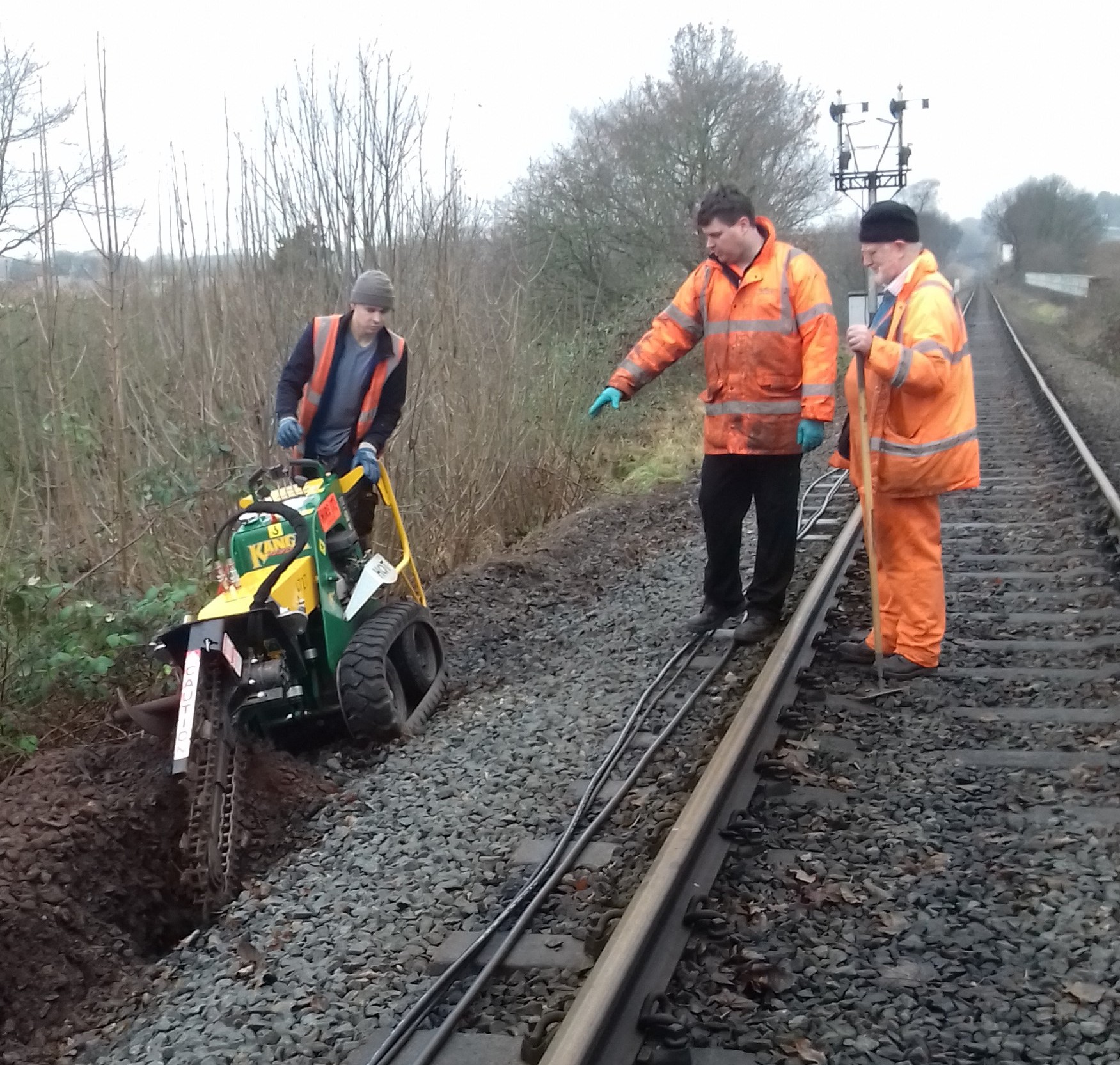 On Sunday 29th January John Phillips, Thomas Franklin and Dave Stowell laid out the three replacement cables (one each signalling, power and telecommunications) from drums using an 08-hauled engineering train (Driver: Don Shadwell). On Monday 30th (pictured) the hired trenching machine was delivered (an almost brand new mini digger made in Australia) and was used to bury the new cables (from the Up Homes to the Worcester Road bridge where the ballast shoulder allowed, otherwise the new cable was encased in flexible tubing).