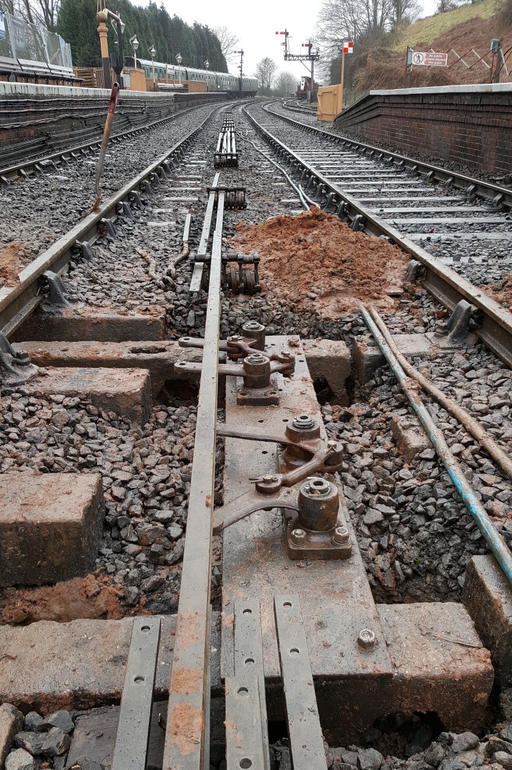 The yard points (no. 14) and the Down Main to No. 2 Platform Line Facing/No. 1 Platform Line points (no. 12) and their facing point locks (FPLs) (and associated signals) were left disconnected until completion. By the second Sunday we had taken the opportunity to replace a worn compensator on 14 points and to reconnect the yard points and FPL. Rodding for 11 and 12 was cut to the correct length, adjusted and tested on 22nd January, finishing at lunchtime. At Bewdley we made up a new insulated FPL stretcher for 12 points at North box, matching the length of the existing stretcher - the scaffold for the Up Inner Homes was not yet erected.