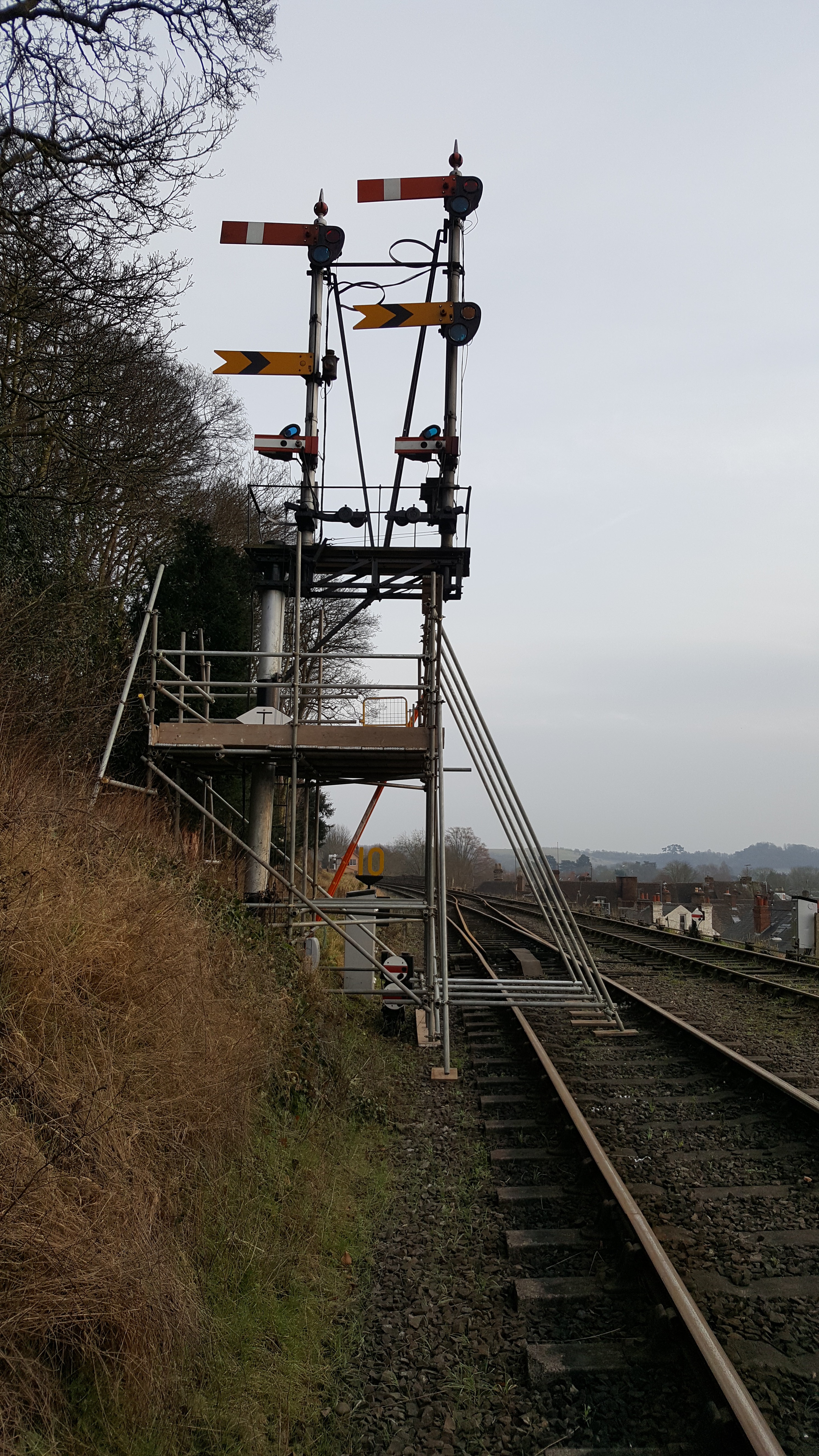 The last job (which we could not start until the P-Way had completed relaying at Waterworks) was to bypass the damaged section of signalling cable there with a temporary cable to allow token working. During the possession arrangements had been made to switch in Hampton Loade temporarily (so that the P-Way could run round there) but by Monday 13th the Loop there was clear and it was switched out again. Two of the signal arms on the Bewdley South From Kidderminster Down Inner Homes bracket were removed, refurbished and repainted by Martin Crane. I think that covers all of our efforts between Christmas and February Half-Term week and, indeed, mentions nearly everyone in the Department.