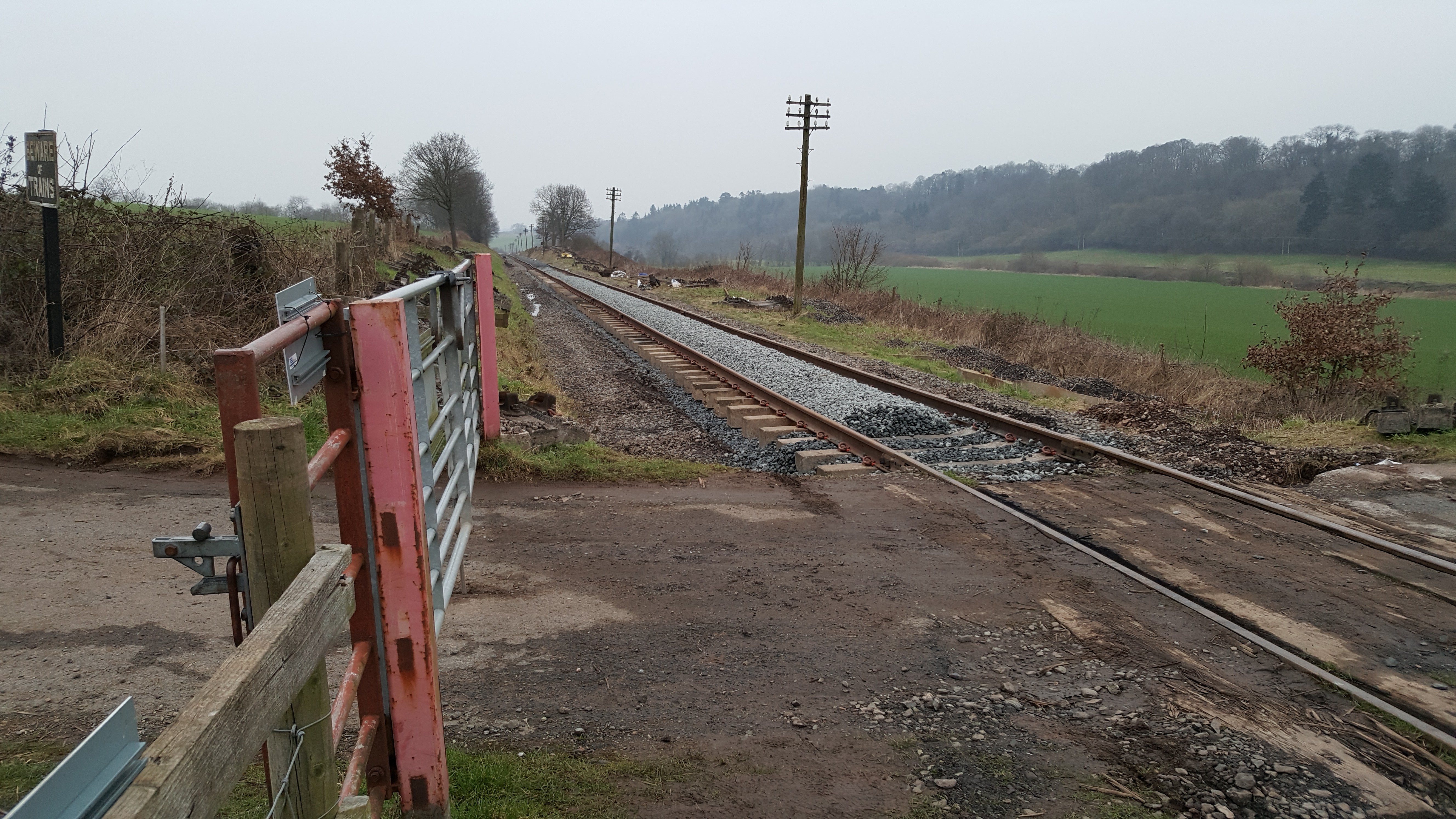 By 14th February the track is there at Waterworks with a sprinkling of ballast - more ballast and tamping in the next few days - as yet we don’t know whether there has been any more damage to the signalling cable. If you look closely at the track beyond the second telegraph pole it looks like aploughed field. [Photo: J. Smith]