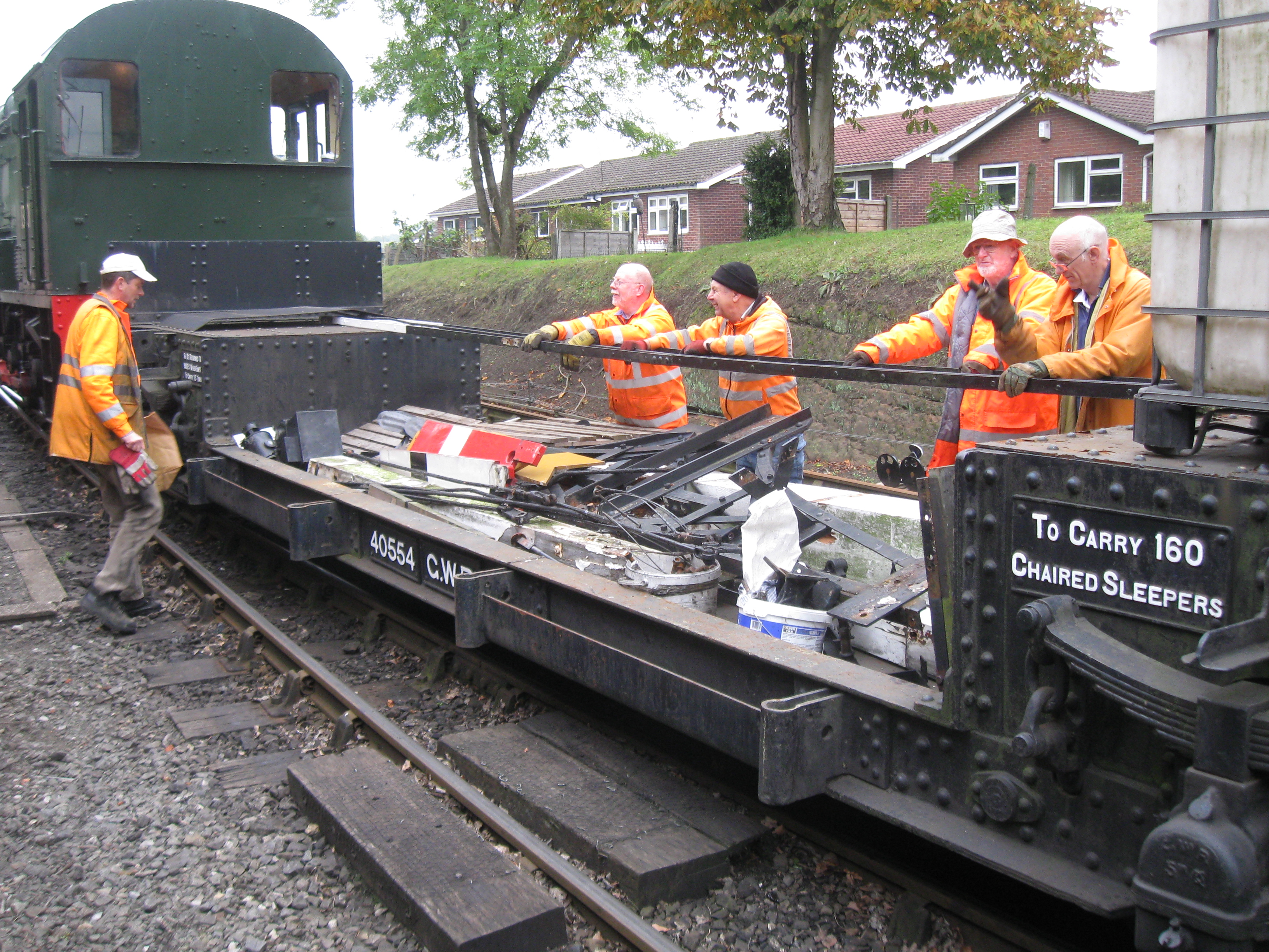 On 18th October an unfitted freight train was placed at our disposal and so we were able to recover the dismantled bracket signal from Bewdley Down Yard to Kidderminster and to deliver some lengths of rodding, some rodding stools and other heavy items to Foley Park. Bricks and water were delivered later that week with the cooperation of the P-Way department, for which many thanks.